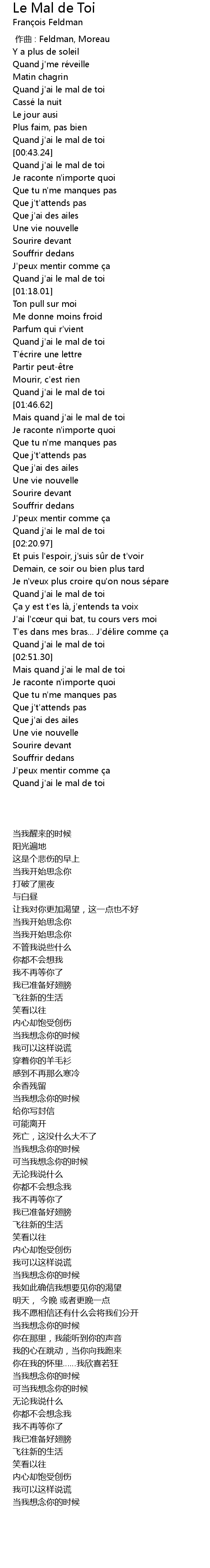 | [00:43.57] | Quand j' ai le mal de toi |