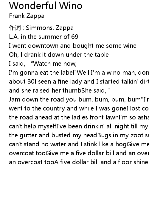 | Jam down the road you bum, bum, bum, bum" I' m a wino man, don' t you know I am? I went to the country and while I was goneI lost control of my body functionsOn the road ahead at the ladies front lawnI' m so ashamed, but I' m a wino man, I can' t help myselfI' ve been drinkin' all night till my eyes got redStumbled on the gutter and busted my headBugs in my zoot suit, been scratchin' like a dogI can' t stand no water and I stink like a hogGive me a five dollar bill and an overcoat tooGive me a five dollar bill and an overcoat tooA five dollar bill and an overcoat tooA five dollar bill and a floor shine shoe |