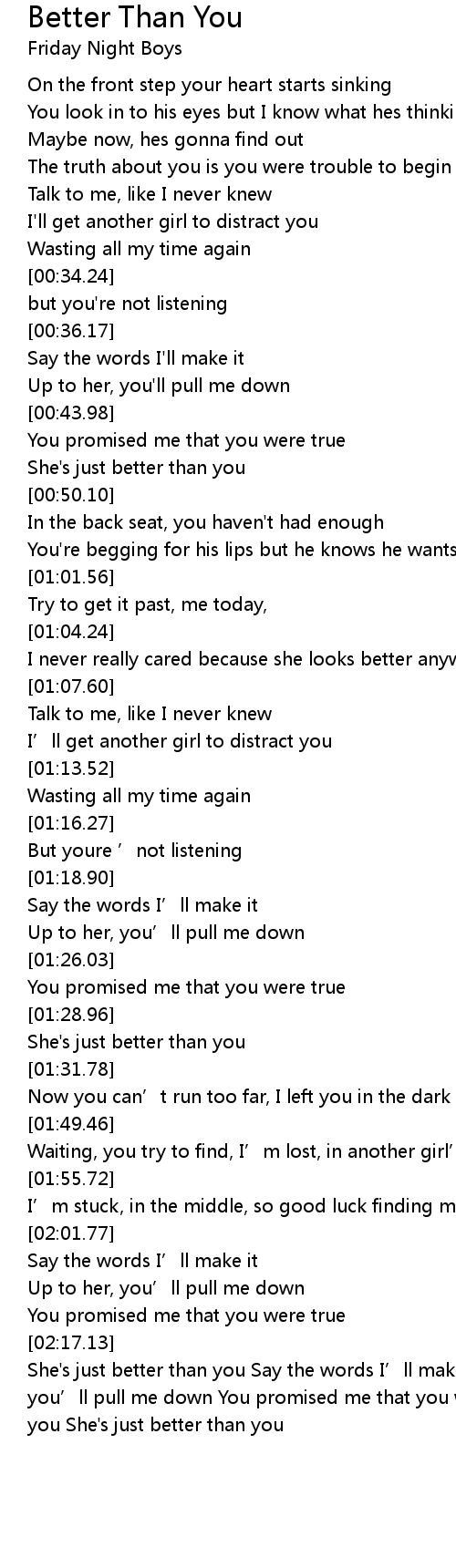 | [02:17.69] | She's just better than you Say the words I’ll make it Up to her, you’ll pull me down You promised me that you were true She's just better than you She's just better than you |