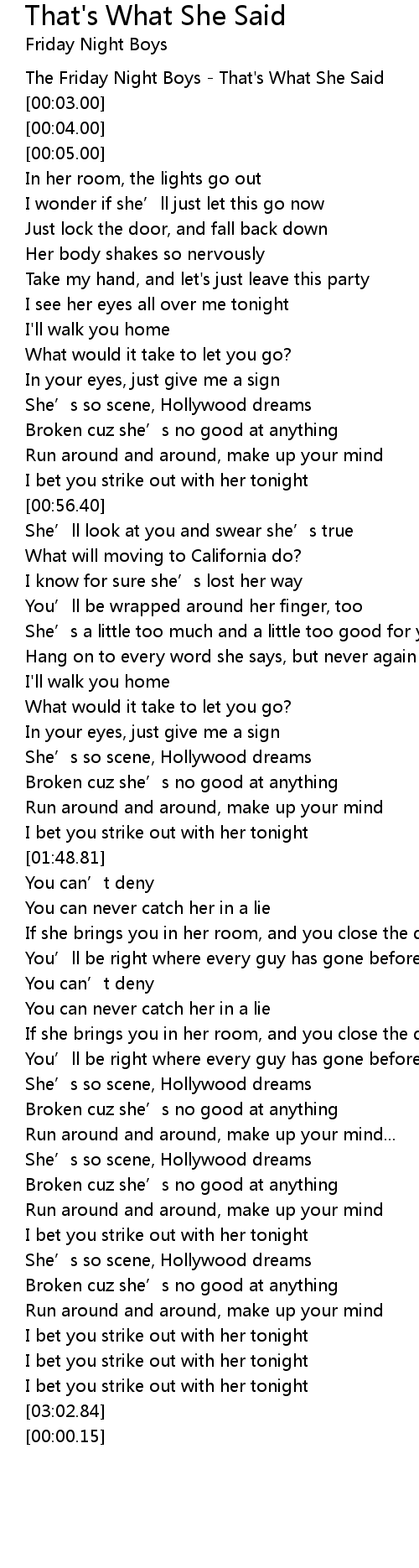 | [00:02.00] | The Friday Night Boys That' s What She Said |