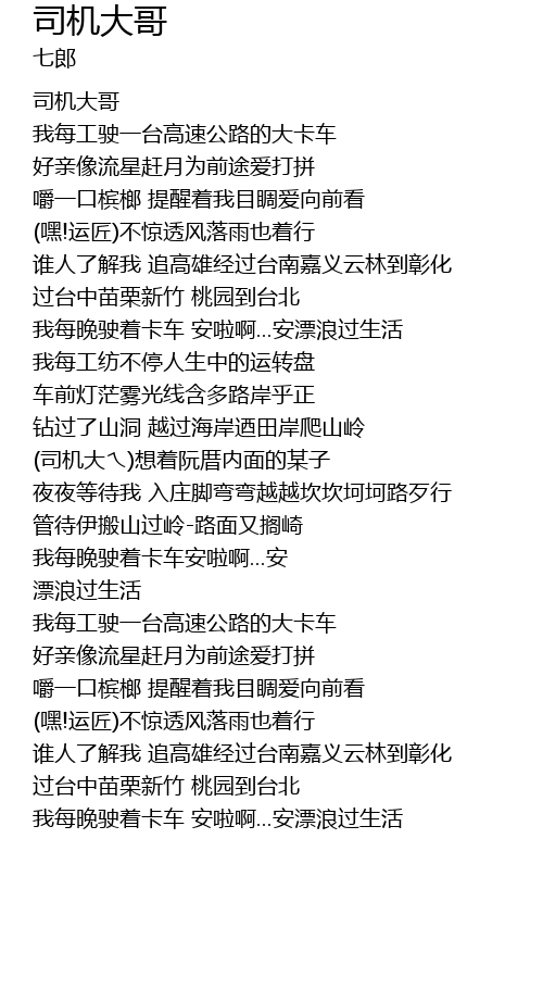| [02:52.00] | 我每晚驶着卡车安啦啊...安 |