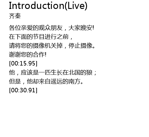 | [00:06.63] | 各位亲爱的观众朋友,大家晚安! |