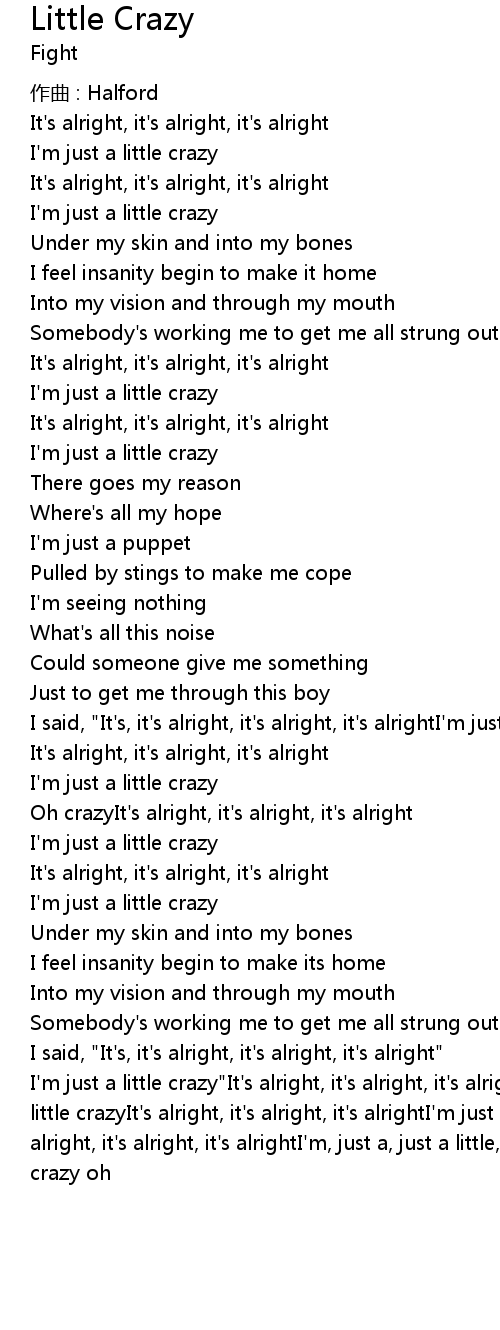 | I' m just a little crazy" It' s alright, it' s alright, it' s alrightI' m just a little crazyIt' s alright, it' s alright, it' s alrightI' m just a little crazyIt' s alright, it' s alright, it' s alrightI' m, just a, just a little, just a little crazy oh |