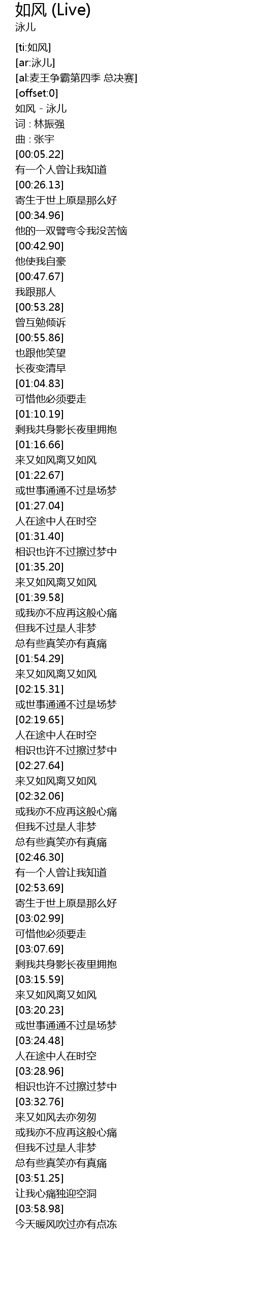 | [03:33.34] | lái yòu rú fēng qù yì cōng cōng |