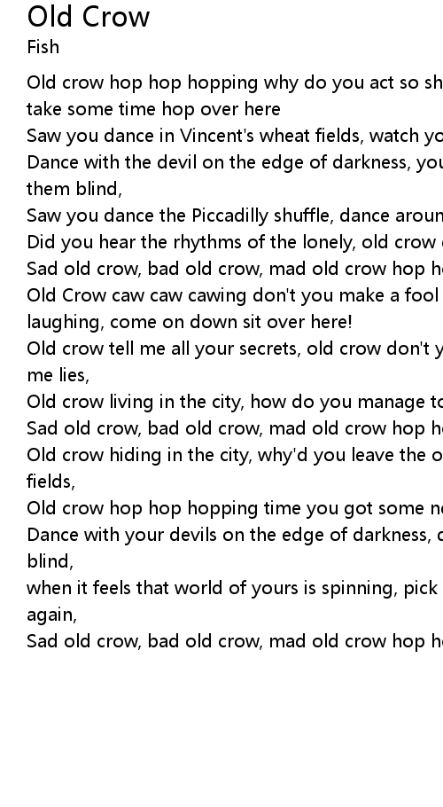 Old Crow caw caw cawing don't you make a fool of me, Old crow cut with all your laughing, come on down sit over here! |