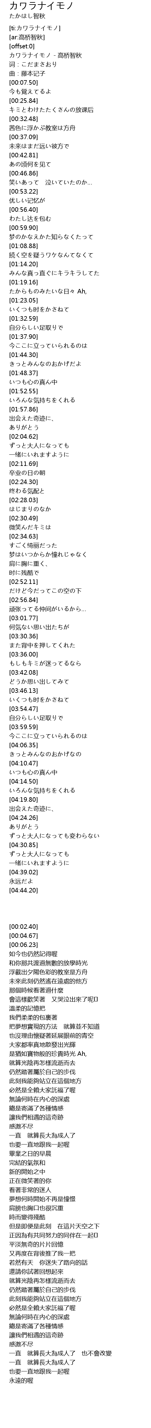 | [00:02.40] | カワラナイモノ - 高桥智秋 |