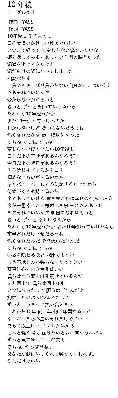 | [01:53.060] | 変わらない僕でいたい10年後も |