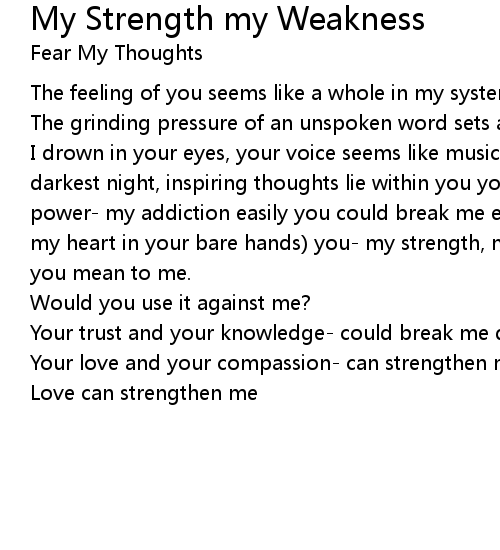 I drown in your eyes, your voice seems like music to me you lighten up the darkest night, inspiring thoughts lie within you your strength- my weakness your power- my addiction easily you could break me easily you throw me down (you hold my heart in your bare hands) you- my strength, my weakness if you'd know what you mean to me. |