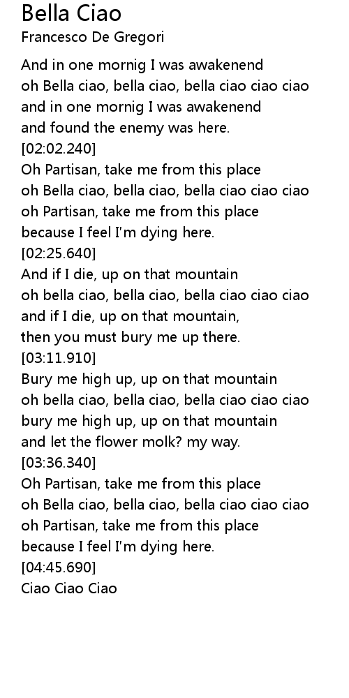 | [03:19.530] | oh bella ciao, bella ciao, bella ciao ciao ciao |