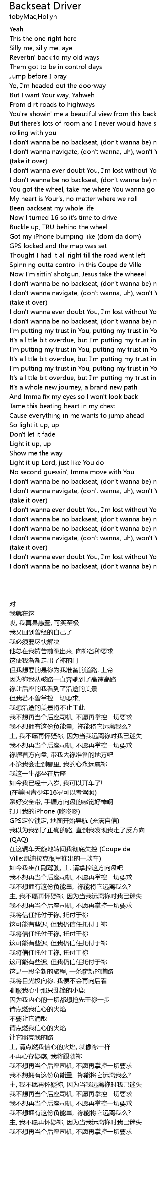 | [00:31.468] | I don't wanna be no backseat, (don't wanna be) no backseat driver |