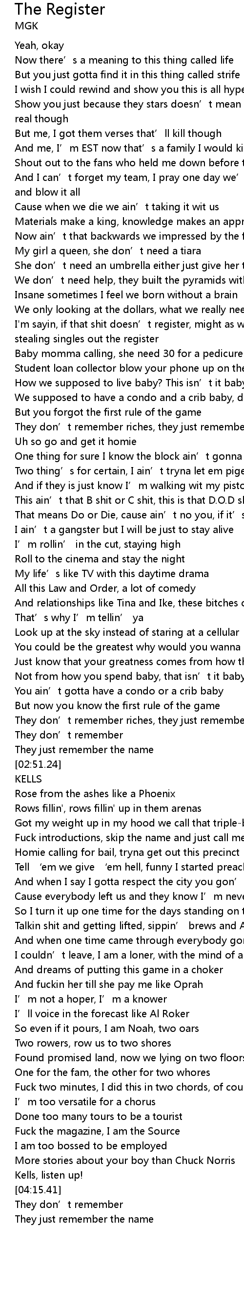 | [01:11.58] | I' m sayin, if that shit doesn' t register, might as well get used to stealing singles out the register |