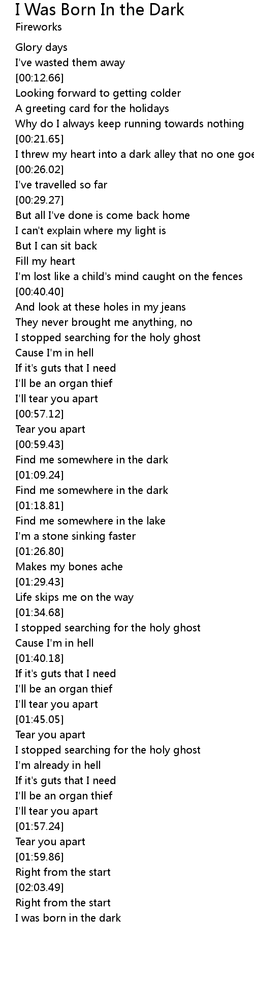 | [02:06.05] | I was born in the dark |