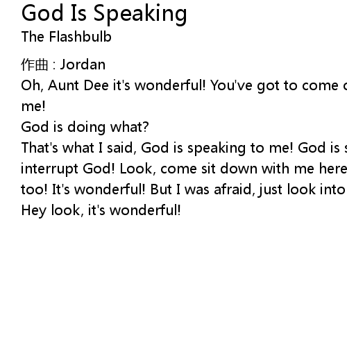 | That' s what I said, God is speaking to me! God is speaking to me, and you can' t interrupt God! Look, come sit down with me here, and you can hear God speak, too! It' s wonderful! But I was afraid, just look into the sky and everything... Hey look, it' s wonderful! |