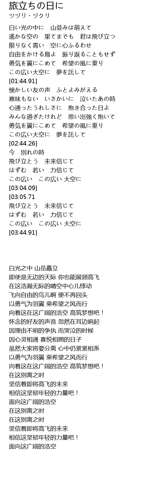 | [00:36.95] | 遙かな空の 果てまでも 君は飛び立つ |