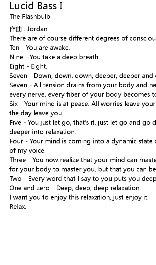 | Seven All tension drains from your body and nervous system. Every muscle, every nerve, every fiber of your body becomes totally relaxed. | |
