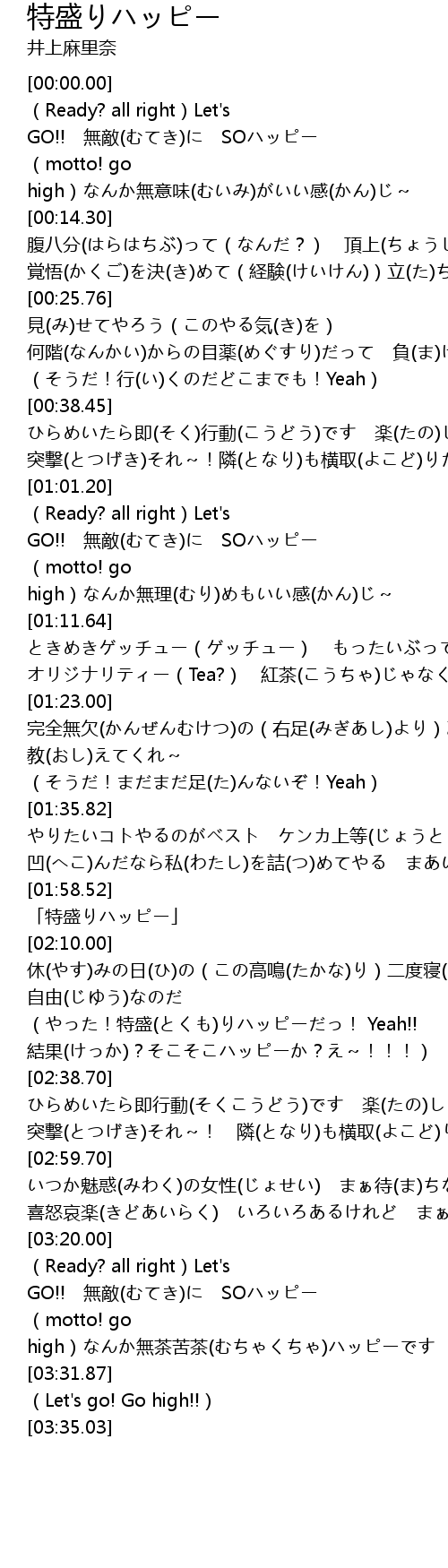 | [03:25.71] | (motto! go high)なんか無茶苦茶(むちゃくちゃ)ハッピーです |