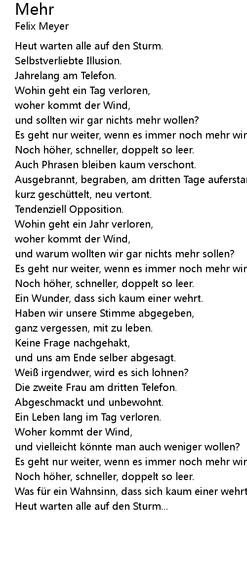 | Es geht nur weiter, wenn es immer noch mehr wird. | |