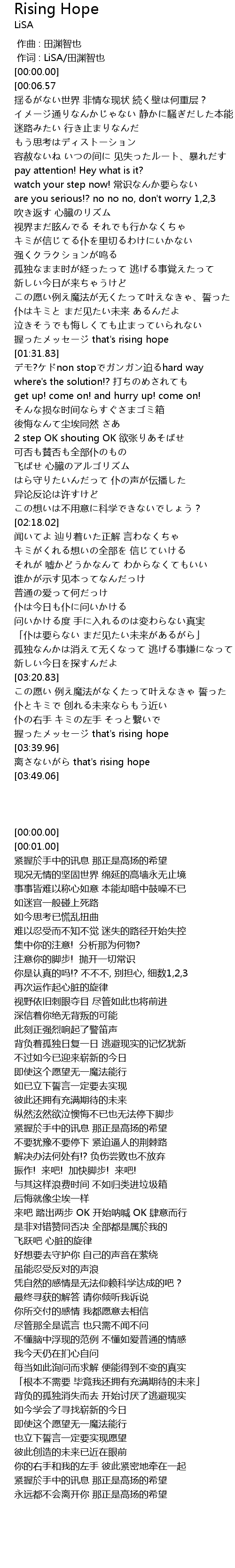 | [00:01.00][00:06.57] | 握ったメッセージ that's rising hope |