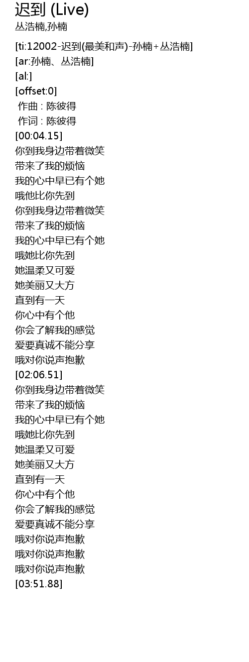 | [ti:12002-迟到(最美和声)-孙楠+丛浩楠] | |