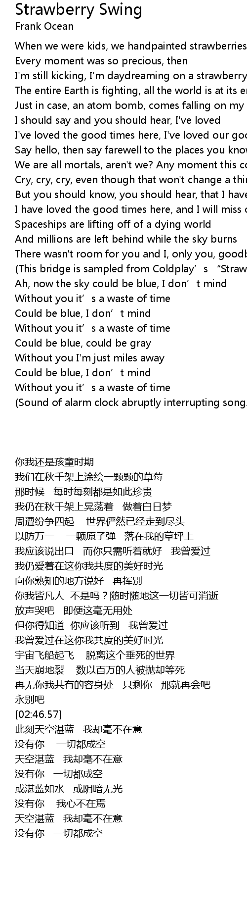 | [02:46.57] | (This bridge is sampled from Coldplay’s “Strawberry Swing.”) |