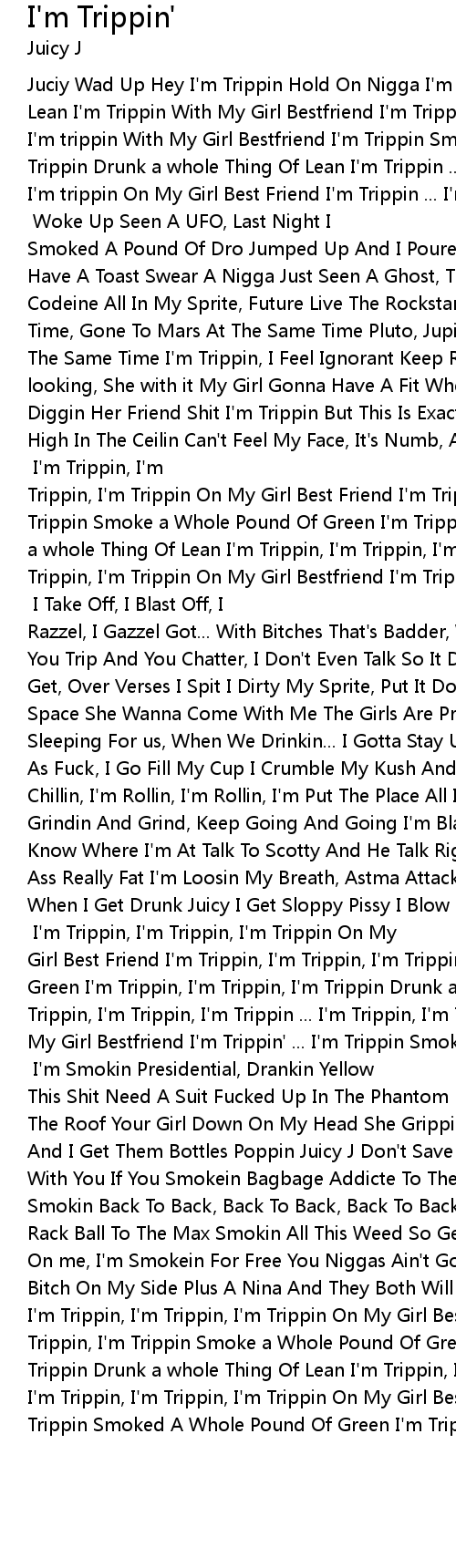 | Juciy Wad Up Hey I'm Trippin Hold On Nigga I'm Trippin Drunk a Whole Thing Of Lean I'm Trippin With My Girl Bestfriend I'm Trippin I'm Trippin, I'm Trippin, I'm trippin With My Girl Bestfriend I'm Trippin Smoke a Whole Pound Of Green I'm Trippin Drunk a whole Thing Of Lean I'm Trippin ... I'm Trippin, I'm Trippin, I'm trippin On My Girl Best Friend I'm Trippin ... I'm trippin' Smoked A Whole Pound Of Weed I'm Trippin Yea Yea [Verse 1:] Woke Up Seen A UFO, Last Night I Smoked A Pound Of Dro Jumped Up And I Poured a Four And I Poured A Four Let's Have A Toast Swear A Nigga Just Seen A Ghost, That Money Comin In Over Flow Codeine All In My Sprite, Future Live The Rockstar Life Astronaut At The Same Time, Gone To Mars At The Same Time Pluto, Jupiter Same Time, Pick A Planet At The Same Time I'm Trippin, I Feel Ignorant Keep Rolling, Keep Sipping, She looking, She with it My Girl Gonna Have A Fit When She Find Out How Hard I'm Diggin Her Friend Shit I'm Trippin But This Is Exactly How I'm Feelin, When I'm High In The Ceilin Can't Feel My Face, It's Numb, And I Ain't Got No Feelings And I'm In NASA Blowin Strong, What the Fuck I'm On [Chorus:] I'm Trippin, I'm Trippin, I'm Trippin On My Girl Best Friend I'm Trippin, I'm Trippin, I'm Trippin Smoke a Whole Pound Of Green I'm Trippin, I'm Trippin, I'm Trippin Drunk a whole Thing Of Lean I'm Trippin, I'm Trippin, I'm Trippin ... I'm Trippin, I'm Trippin, I'm Trippin On My Girl Bestfriend I'm Trippin' ... I'm Trippin Smoked A Whole Pound Of Green I'm Trippin, Yea Yea [Verse 2:] I Take Off, I Blast Off, I Razzel, I Gazzel Got... With Bitches That's Badder, With Asses That's Fatter, You Trip And You Chatter, I Don't Even Talk So It Don't Even Matter How High I Get, Over Verses I Spit I Dirty My Sprite, Put It Down in My... I'm Going To Space She Wanna Come With Me The Girls Are Pretty The Night's Are Long Aye, No Sleeping For us, When We Drinkin... I Gotta Stay Up, I Took Me A Up Now I'm Buck As Fuck, I Go Fill My Cup I Crumble My Kush And Fill My Blunt Up I'm Close, I'm Chillin, I'm Rollin, I'm Rollin, I'm Put The Place All Into Motion, In Motion I Grindin And Grind, Keep Going And Going I'm Blacking Out On Track Like I Don't Know Where I'm At Talk To Scotty And He Talk Right Back I'm Diggin Yo Body Yo Ass Really Fat I'm Loosin My Breath, Astma Attack I'm so Bizy I Be Gettin Dizzy When I Get Drunk Juicy I Get Sloppy Pissy I Blow Good Good In Every City Countin Money Palms Still Itchy [Chorus:] I'm Trippin, I'm Trippin, I'm Trippin On My Girl Best Friend I'm Trippin, I'm Trippin, I'm Trippin Smoke a Whole Pound Of Green I'm Trippin, I'm Trippin, I'm Trippin Drunk a whole Thing Of Lean I'm Trippin, I'm Trippin, I'm Trippin ... I'm Trippin, I'm Trippin, I'm Trippin On My Girl Bestfriend I'm Trippin' ... I'm Trippin Smoked A Whole Pound Of Green I'm Trippin, Yea Yea [Verse 3: Juicy J] I'm Smokin Presidential, Drankin Yellow This Shit Need A Suit Fucked Up In The Phantom Like Tony Montana Bitch Let Back The Roof Your Girl Down On My Head She Gripping The Head Just Like A Wave Cap And I Get Them Bottles Poppin Juicy J Don't Save Caps I Can't Match This Kush With You If You Smokein Bagbage Addicte To The Weed I'm A Fuckin Addict I'm Smokin Back To Back, Back To Back, Back To Back I Flip A Stack To Stack, Rack To Rack Ball To The Max Smokin All This Weed So Geeked Like I Don't Need Lungs Hate On me, I'm Smokein For Free You Niggas Ain't Got The Funds And I Keep A Dime Bitch On My Side Plus A Nina And They Both Will Get You Wet Like Aqua [Chorus:] I'm Trippin, I'm Trippin, I'm Trippin On My Girl Best Friend I'm Trippin, I'm Trippin, I'm Trippin Smoke a Whole Pound Of Green I'm Trippin, I'm Trippin, I'm Trippin Drunk a whole Thing Of Lean I'm Trippin, I'm Trippin, I'm Trippin ... I'm Trippin, I'm Trippin, I'm Trippin On My Girl Bestfriend I'm Trippin' ... I'm Trippin Smoked A Whole Pound Of Green I'm Trippin, Yea Yea |