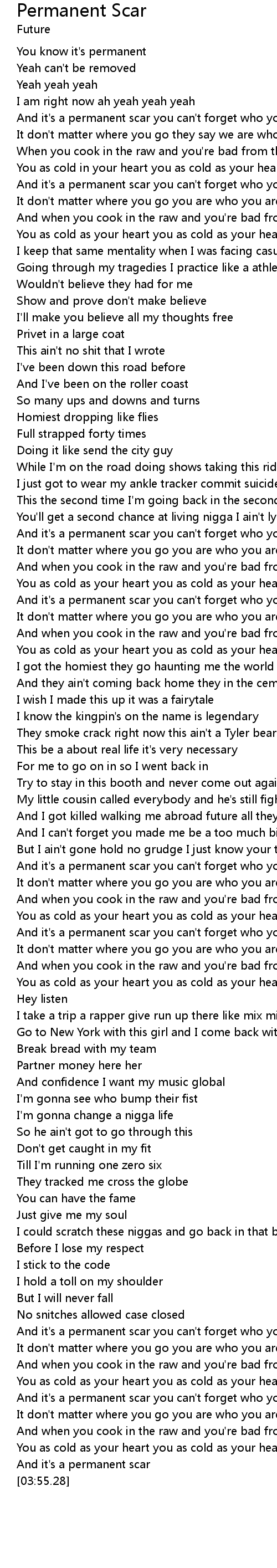 | [00:13.55] | And it's a permanent scar you can't forget who you are |