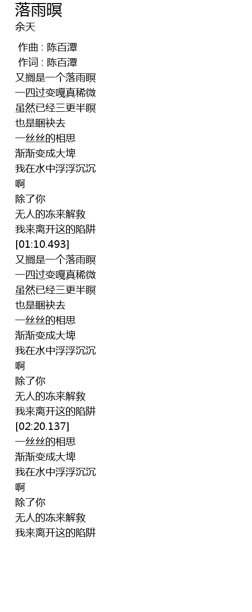 | [01:30.908] | 又搁是一个落雨瞑 |