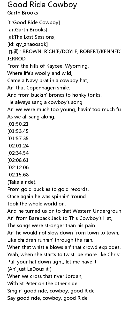 | [02:57.54] | Singin' good ride, cowboy, good Ride. |