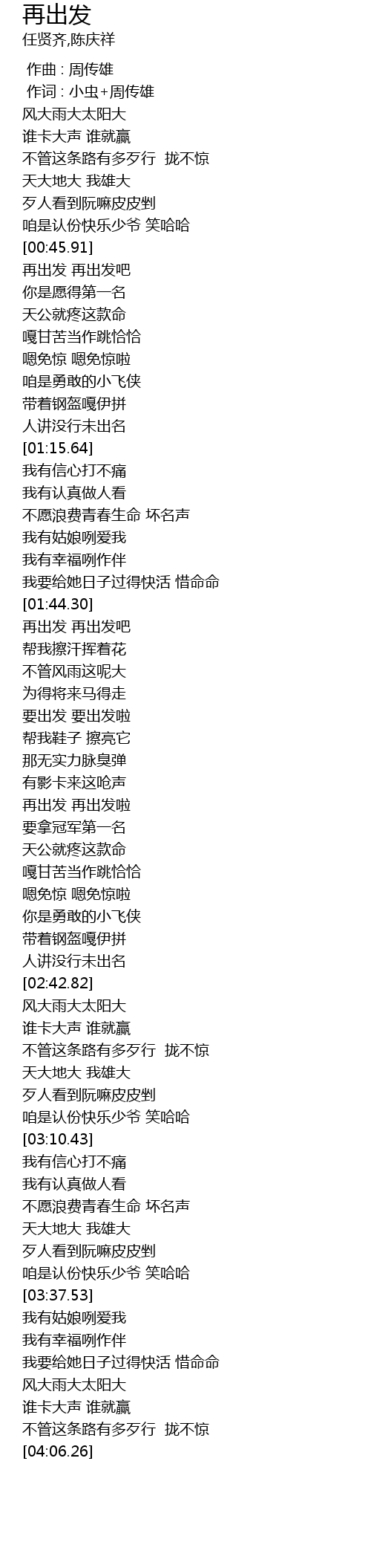 | [01:45.64] | zai chu fa zai chu fa ba |