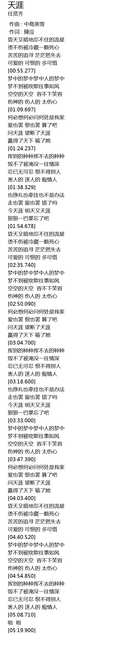 | [03:55.090] | wèn tiān yá wàng duàn le tiān yá |