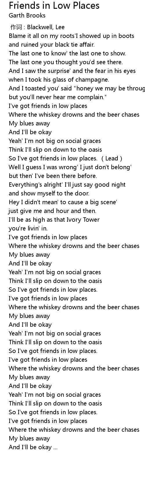 | [01:12.07] | So I've got friends in low places. (Lead) |