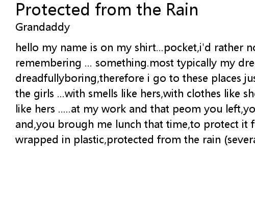 | hello my name is on my shirt...pocket,i'd rather not speak right now,i'm remembering ... something.most typically my dreams are dreadfullyboring,therefore i go to these places just towith hair like hers,see the girls ...with smells like hers,with clothes like she wore,with handwriting like hers .....at my work and that peom you left,you wrote me little letters and,you brough me lunch that time,to protect it from the rain.on my windshield wrapped in plastic,protected from the rain (several times |