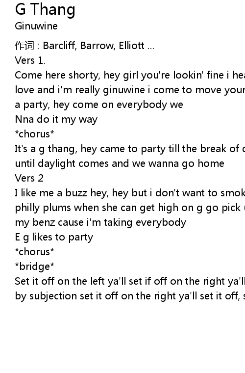 | It's a g thang, hey came to party till the break of dawn watch my speakers bang until daylight comes and we wanna go home | |