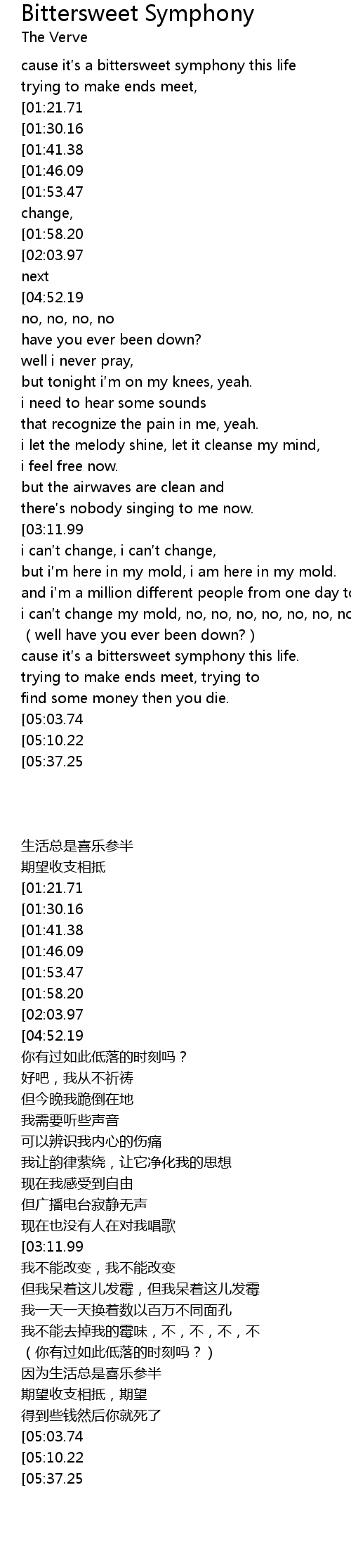 | [03:44.94] | cause it s a bittersweet symphony this life. |