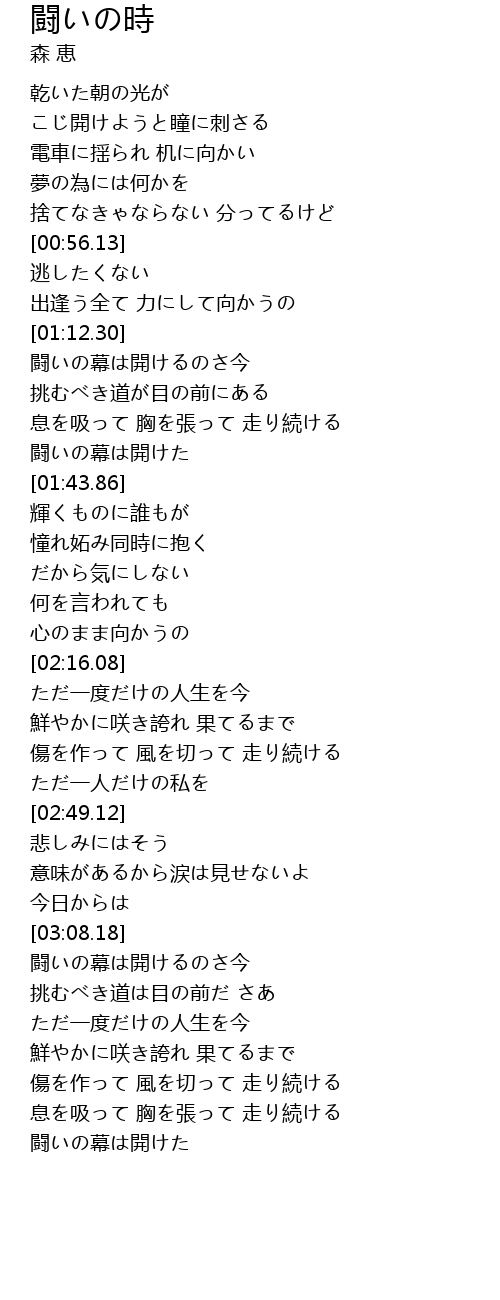 | [01:12.76] | 闘いの幕は開けるのさ今 |
