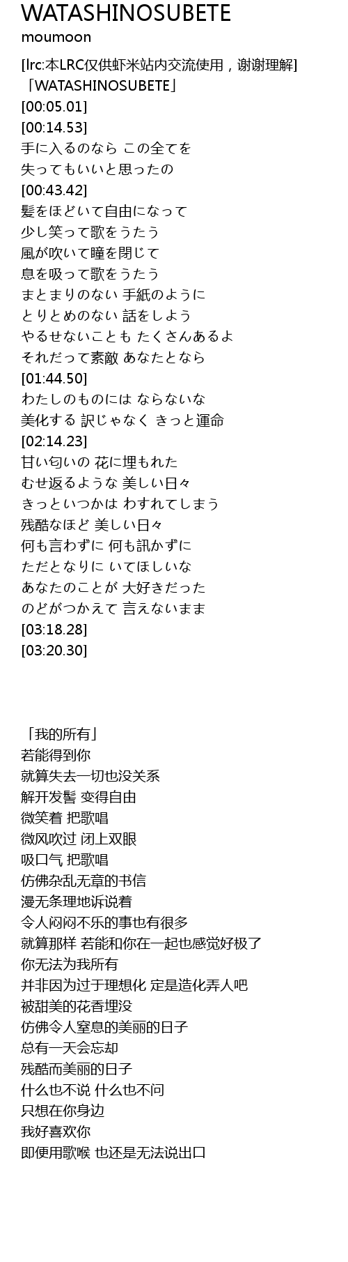 | [00:00.66] | 「WATASHINOSUBETE」 |