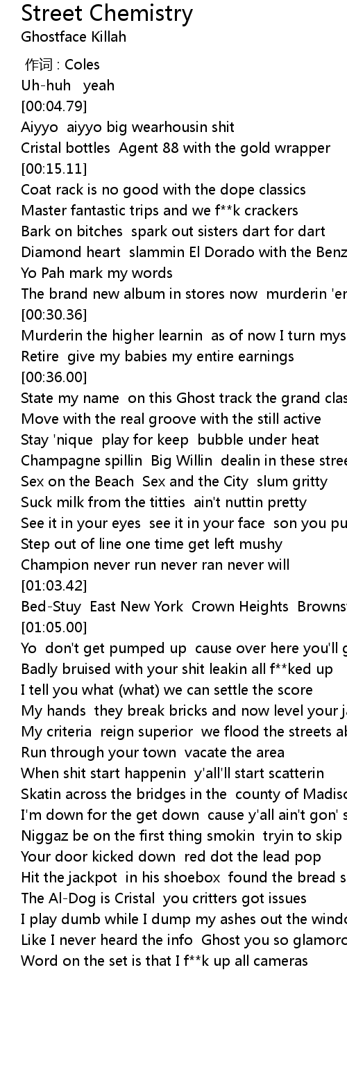 | [01:12.32] | Badly bruised with your shit leakin all f**ked up |
