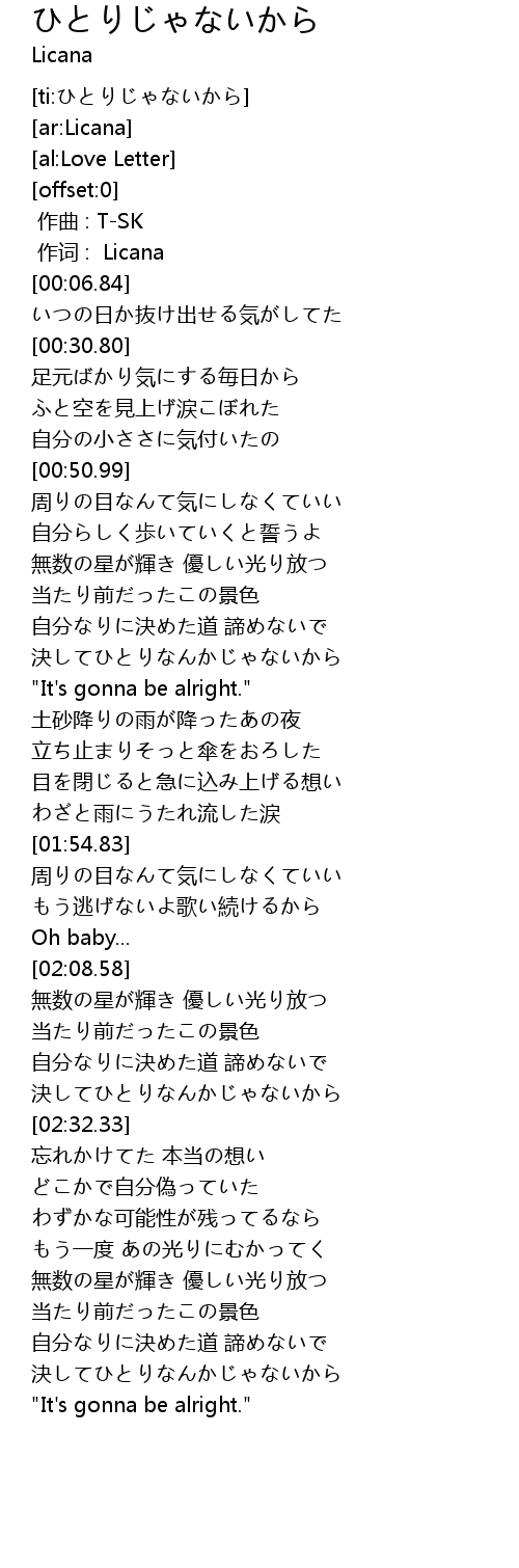 | [03:18.74] | 決してひとりなんかじゃないから |