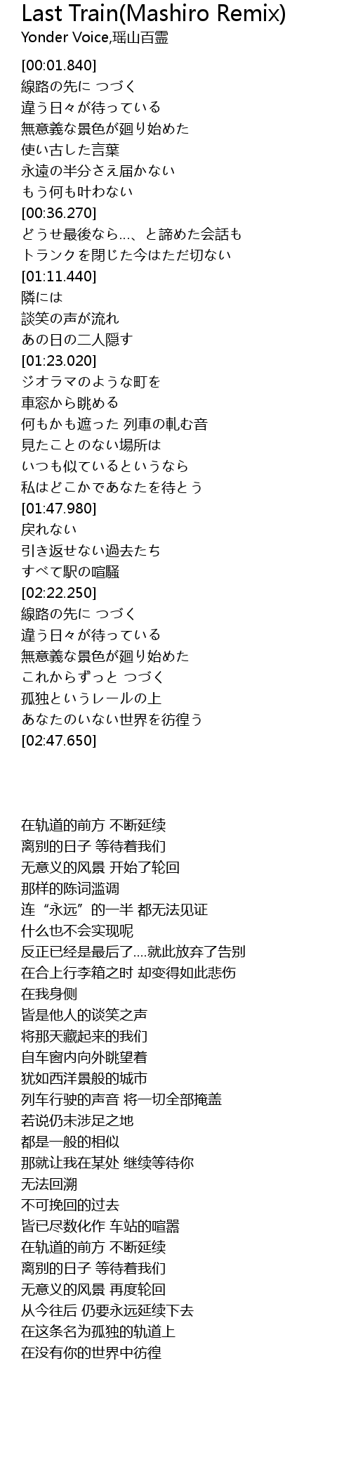 | [01:31.050] | 何もかも遮った 列車の軋む音 |