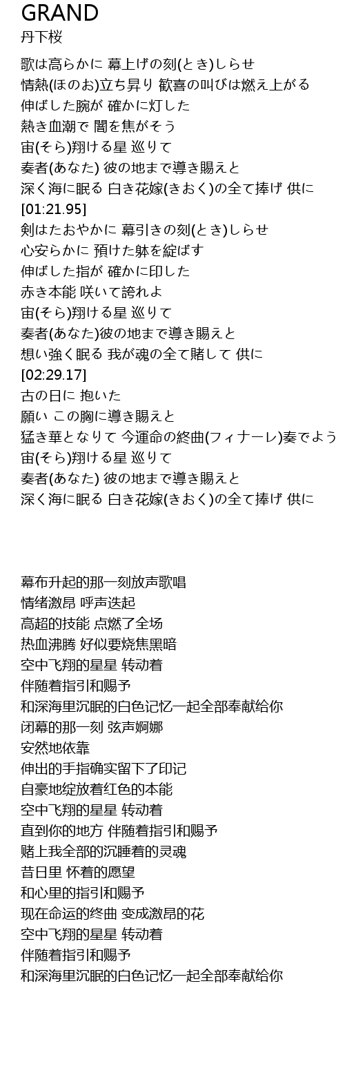 | [00:36.49] | 情熱(ほのお)立ち昇り 歓喜の叫びは燃え上がる |