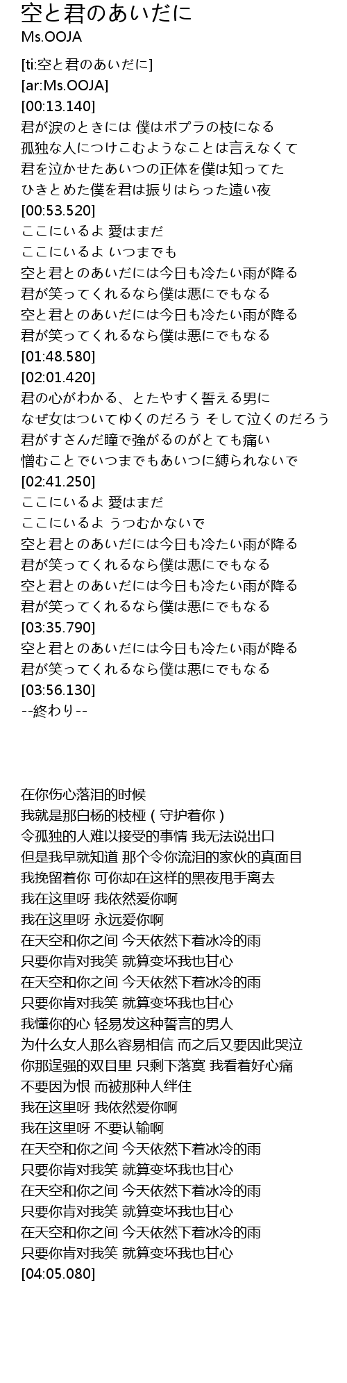 | [01:13.120] | 空と君とのあいだには今日も冷たい雨が降る |