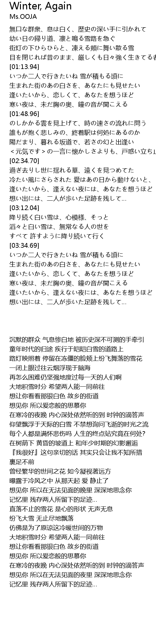 | [00:41.02] | 無口な群衆、息は白く、歴史の深い手に引かれて |