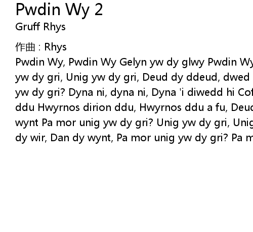 | Pwdin Wy, Pwdin Wy Gelyn yw dy glwy Pwdin Wy, Pwdin Wy, Misoedd o dy blwyf Unig yw dy gri, Unig yw dy gri, Deud dy ddeud, dwed dy wir, Dan dy wynt, Pa mor unig yw dy gri? Dyna ni, dyna ni, Dyna 'i diwedd hi Cofia fi, cofia ni, Terfyn dirion ddu Hwyrnos dirion ddu, Hwyrnos ddu a fu, Deud dy ddeud, dwed dy wir, Dan dy wynt Pa mor unig yw dy gri? Unig yw dy gri, Unig yw dy gri, Deud dy ddeud, dwed dy wir, Dan dy wynt, Pa mor unig yw dy gri? Pa mor unig yw ein cri? |