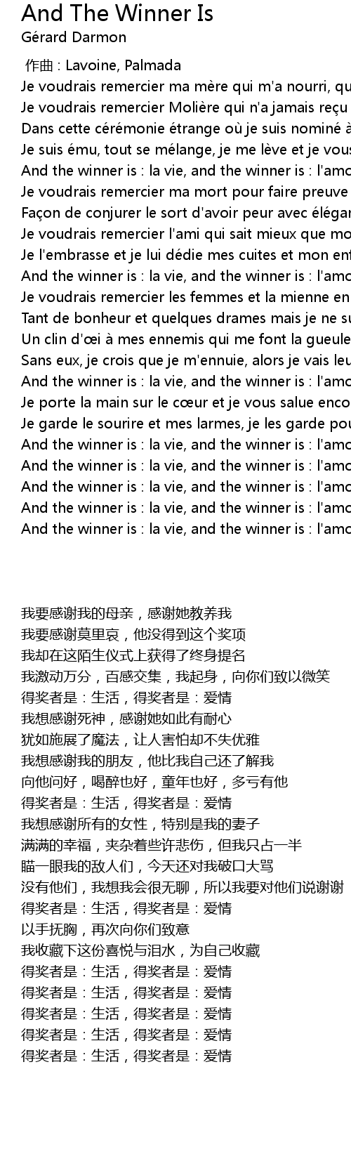 | [03:14.410] | And the winner is : la vie, and the winner is : l' amour. |