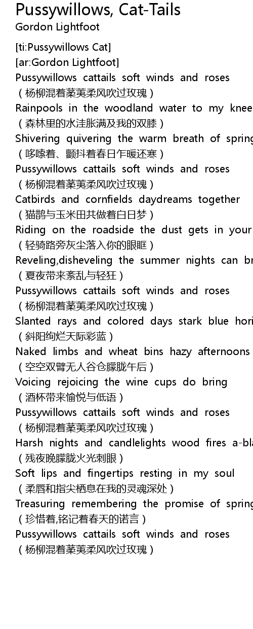 | [00:19.139] | Pussywillows cattails soft winds and roses |