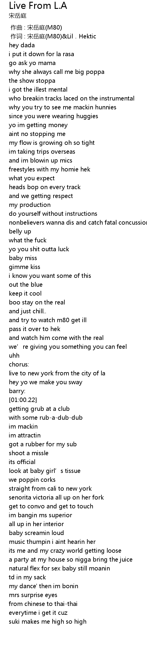 | [00:01.00] | 作词 : 宋岳庭(M80)&Lil.Hektic |