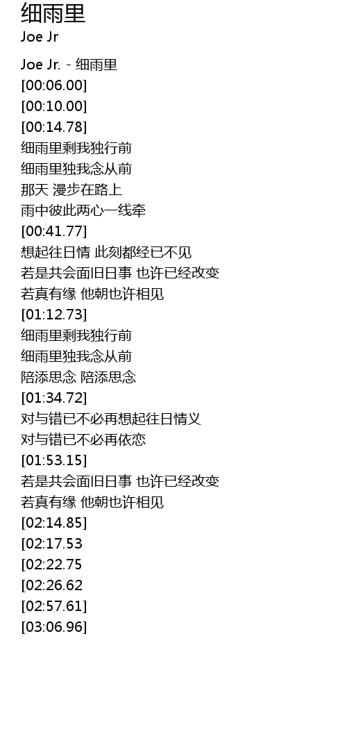 | [00:02.00] | Joe Jr. - 细雨里 |