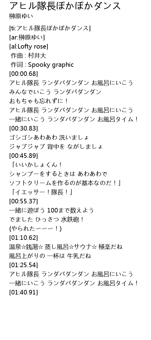 | [00:16.06] | アヒル隊長 ランダバダンダン お風呂にいこう |