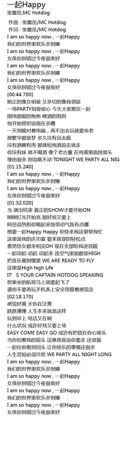| [00:01.00] | 作词 : 张震岳/MC Hotdog |