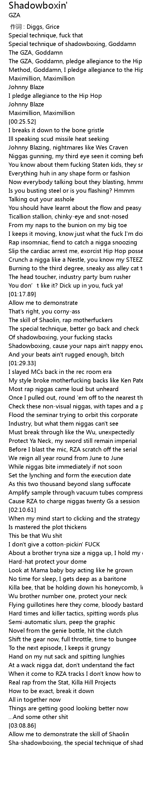 | [01:21.03] | The skill of Shaolin, rap motherfuckers |